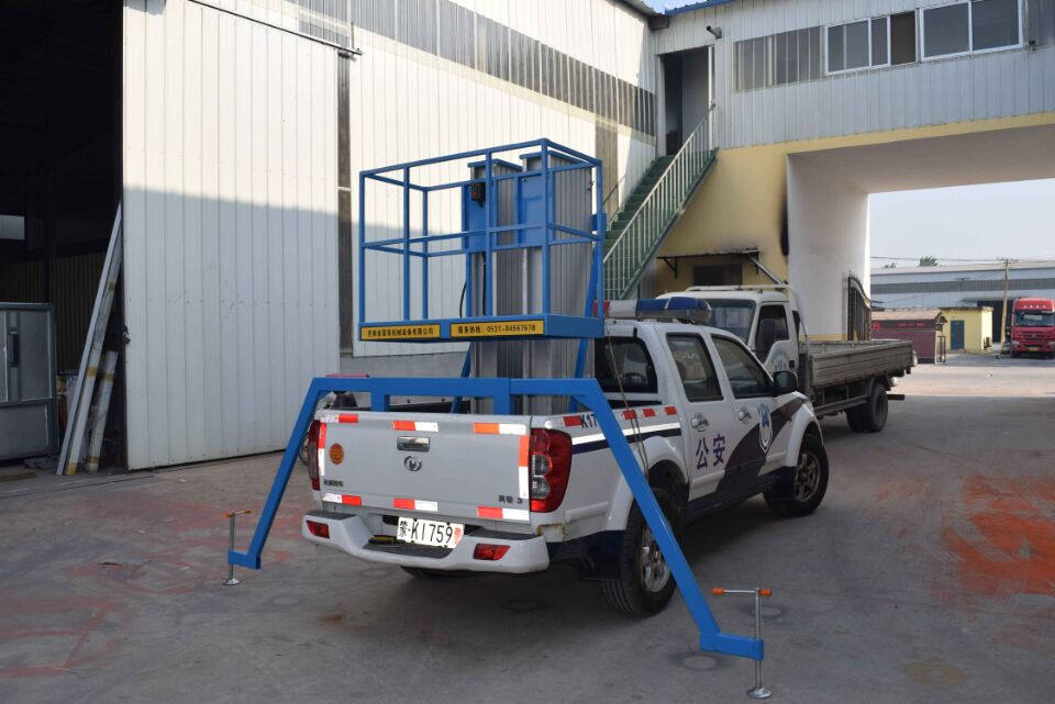 車載式升降平臺將升降平臺固定在電瓶搬運車或貨車上,借用各種車型底盤加固平臺底架。支撐腿樣式分為液壓自動式和手動螺旋式。