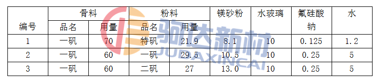 鋼包鋁鎂澆注料的耐火骨料,一般用特級,一級或二級礬土熟料,其最大料徑為15~17mm,顆粒級配;>10mm,27%;10~5mm,39%;5~3mm,19%;3~0.09mm,15%;耐火粉料特級或一級礬土熟料制取,細度為小于0.09mm的占95%以上;水玻璃模數(shù)為2.8~3.3,密度為1.4~1.45g/cm3,另加2%~5%的潔凈水,實際配料時水玻璃密度約為1.33g/cm3;采用氟硅酸鈉作促凝劑,其用量占料總質(zhì)量的0.08%~0.3%,鎂砂粉中MgO>90%,其細度為小于0.09mm的應大于95%。鋼包鋁鎂質(zhì)澆注料的通用配合比見表1-1。