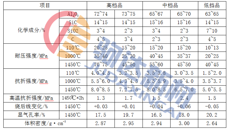 從表1-1中看出,化學(xué)成分基本相似,但性能有較大區(qū)別。高檔品的主體材料為電熔致密白剛玉,中檔品的為電熔棕剛玉,低檔品的則為優(yōu)質(zhì)燒結(jié)礬土熟料:隨著加熱溫度的升高,各檔次產(chǎn)品的強(qiáng)度也隨之增大,與其烘干強(qiáng)度相比,一般提高1~3倍。