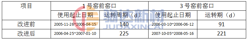 改進(jìn)前后對(duì)比如表1所示。經(jīng)過(guò)全方位優(yōu)化改進(jìn)后,窯口澆注料使用壽命實(shí)現(xiàn)了質(zhì)的飛躍,更換周期不但滿(mǎn)足了窯磚檢修的需要,甚至明顯超過(guò)了窯磚壽命,避免了檢修時(shí)廢舊澆注料難拆除的被動(dòng)局面,自檢修以來(lái),未再發(fā)生過(guò)因窯口澆注料而停窯檢修的情況。