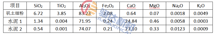 結(jié)合劑選用純鋁酸鈣水泥,其比表面積(cm2·g-1)分別為4010和4962;添加劑選用三聚磷酸鈉(STP)和六偏磷酸鈉(SHP)。表1為礬土和純鋁酸鈣水泥的化學(xué)分析結(jié)果。