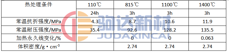 常溫下澆注成型的硅溶膠結合該剛玉—莫來石澆注料試樣經不同溫度熱處理后的性能見表2。可以看出:烘干后試樣的常溫抗折強度和常溫耐壓強度與普通低水泥高鋁澆注料的相當;815℃熱處理后試樣的常溫抗折強度和常溫耐壓強度比烘干后的顯著增大,并且隨著熱處理溫度的繼續升高而繼續增大,但1400℃熱處理后試樣的性能指標與1100℃熱處理后的差別不大。