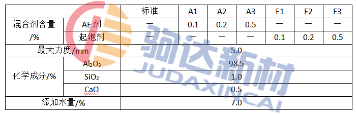 各種低水泥澆注料在進行1min的粉體混合后,添加表1所示的水量混煉5min,然后澆注在40mm×40mm×160mm的?騼(nèi)。另外,測定熱應(yīng)力用的試樣澆注在40mm×40mm×100mm的模框內(nèi)。在20℃的氣溫下養(yǎng)護24h,然后在110℃下干燥24h,以此作為試驗材料。
