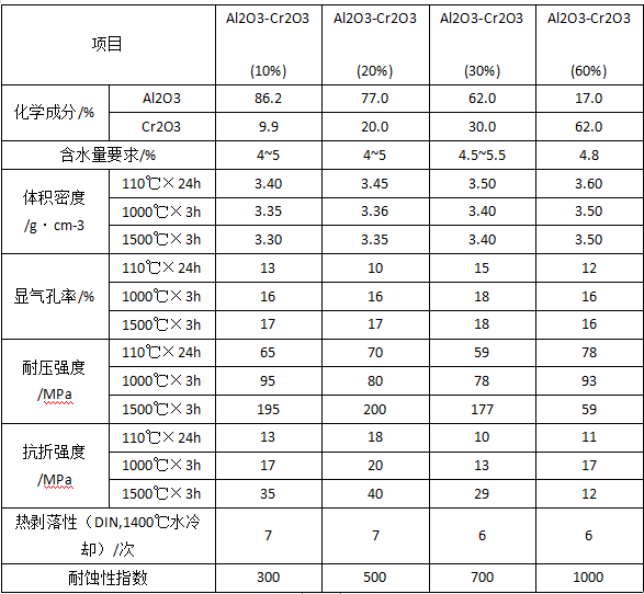 鉻剛玉耐火澆注料主要化學成分是Al2O3和Cr2O3,采用Cr2O3-Al2O3混合料配置的耐火澆注料具荷重軟化溫度高、高溫耐壓強度高、高溫抗折強度高、抗侵蝕性強、致密性好的優(yōu)點。原則上鉻剛玉耐火澆注料是可以采用任何比例的Cr2O3/Al2O3比例。鉻含量越好的鉻剛玉耐火澆注料,其耐壓強度、抗折強度、抗渣侵蝕性能越高。表1列出了不同鉻含量的鉻剛玉耐火澆注料的性能指標。
