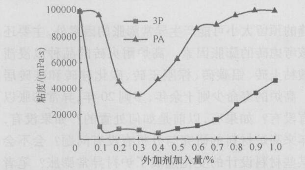 低水泥耐火澆注料在生產(chǎn)時需添加適量的輔助原料以改變成品的性能,減水劑是其中的一類選用減水劑三聚磷酸鈉 (3P)和氨基磺酸鹽系 (PA)。做成品的實驗,試驗原料的配比如下 :高鋁礬土粉 53% ,水泥 (CA - 70 ) 13% ,硅灰 7% ,α-AL2O3微粉10% ,石英粉 7% ,廣西粘土 10%。將配好的料充分混合均勻制成干混料 ,然后稱取 1 kg混合料 ,分別加入不同量的減水劑 3P和 PA,再加水 (加水量為干粉質量的30% )攪拌3 m in后 ,成為高濃度的懸浮漿體,立即測量此漿體的粘度。
