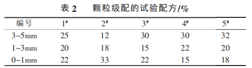 原料是以棕剛玉為骨料,碳化硅、水泥、uf-SiO2、α-Al2O3 為基質,試驗用澆注料的骨料采用≤1mm、1 ~3mm、3~5mm 三級粒度。骨料和粉料的質量比為 63~70∶37~30。澆注料的致密程度和流動性跟顆粒級配密切相關,而最佳的顆粒級配又隨骨料種類、臨界粒度的大小和基質組成的不同而不同,最合適的顆粒級配應該由試驗確定。本試驗選擇5種不同的顆粒級配,細粉部分全部相同,顆粒級配的試驗配方如表2所示。這5個配方的試驗結果示于圖1。