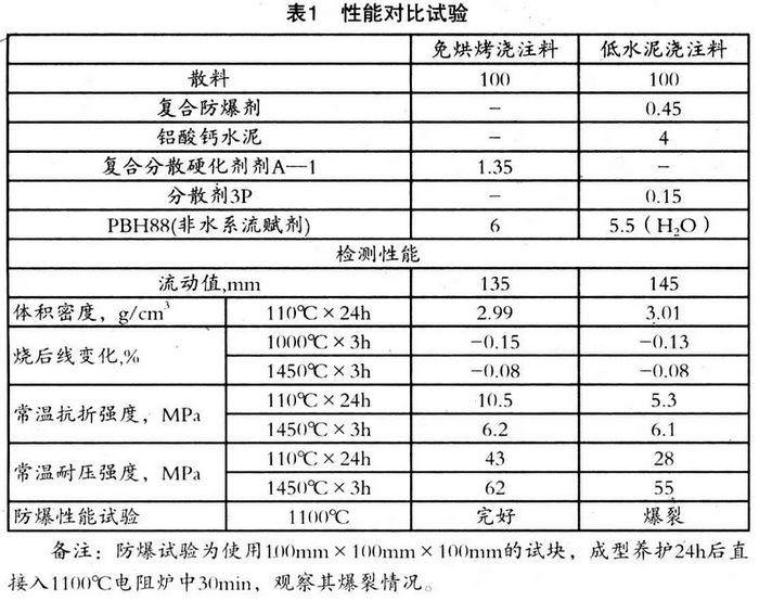 對(duì)于只有單鐵口的高爐而言,出鐵間隔短,休風(fēng)時(shí)間少,若采用低水泥澆注料,無(wú)法保證足夠的烘烤時(shí)間,所以大多數(shù)此類高爐仍采用免烘烤鐵溝搗打料。免烘烤搗打料存在組織疏松、抗氧化性差、通鐵量低、現(xiàn)場(chǎng)施工勞動(dòng)強(qiáng)度大等缺點(diǎn);另外也有使用鐵溝預(yù)制件拼接安裝的,但是接縫處理問(wèn)題一直沒(méi)有很好的解決辦法,因此如何有效的解決單鐵口高爐出鐵溝的壽命問(wèn)題備受關(guān)注。為此,我們的研發(fā)人員在對(duì)高爐出鐵溝的工作條件、損毀機(jī)理、鐵水及熔渣的化學(xué)組成等方面作了大量分析研究后,開發(fā)出了適用于高爐出鐵溝的免烘烤澆注料。 二、研制思路 普通低水泥澆注料當(dāng)含水量較高,劇烈升溫時(shí)水分會(huì)大量且迅速的排出,而當(dāng)水分排出通道不暢時(shí),水分不能及時(shí)排出,蒸汽壓力激增,就會(huì)引起材料爆裂。這種材料存在下述問(wèn)題:①由于用氧化鋁水泥作硬化劑,引入 Ca0 造成基質(zhì)低熔點(diǎn),降低了耐蝕性;②加入干燥助劑金屬 Al粉,金屬 Al 粉的添加對(duì)干燥是有效的,但是施工體易產(chǎn)生龜裂,帶來(lái)組織劣化的傾向;③磷酸鹽結(jié)合材料存在結(jié)合劑遷移問(wèn)題,造成材料表面離子富集,堵塞氣孔通道,容易出現(xiàn)分層爆裂剝落的現(xiàn)象 開發(fā)的免烘烤澆注料的設(shè)計(jì)思路是利用澆注料組織致密、施工方便等特點(diǎn),使用非水系的液體有機(jī)化合物,作為流動(dòng)性賦予劑及結(jié)合劑,保證澆注料的施工流動(dòng)性,堿性材料作為硬化劑,加入到混好的耐火散料中攪拌,得到一種具有可振動(dòng)施工的流動(dòng)性的材料,澆注成型后,在常溫或溝體余熱下經(jīng)過(guò)很短時(shí)間硬化脫模,由于材料中水分非常低,所以不需要烘烤可直接出鐵,達(dá)到減少作業(yè)時(shí)間、降低勞動(dòng)強(qiáng)度、提高使用壽命的目的。 出鐵溝材料都必須具備耐蝕性,耐磨性等高性能,我們產(chǎn)品所用的材料是由粒度經(jīng)過(guò)嚴(yán)格篩選的高檔原料為骨料,以及由粘土及在各溫度范圍能產(chǎn)生熱態(tài)強(qiáng)度的各種結(jié)合材料的混合物所組成,電熔棕剛玉(耐蝕性、耐磨性較好,抗鐵水性強(qiáng)。為了提高溝料的使用壽命,要求剛玉的氣孔率要低)、碳與碳化硅(體積變化小具有耐熱性,難于被鐵水、熔渣濕潤(rùn),有化學(xué)穩(wěn)定性,碳對(duì)鐵、渣均能適應(yīng),而碳化硅更適應(yīng)于熔渣)、結(jié)合材料(非水系的液體有機(jī)化合物,從低溫到高溫能保持堅(jiān)固的組織強(qiáng)度的結(jié)合材料,保證材料足夠的強(qiáng)度),另外添加抗氧化劑、分散劑等外加劑,改善材料性能。主要原料其理化指標(biāo)見表 1。